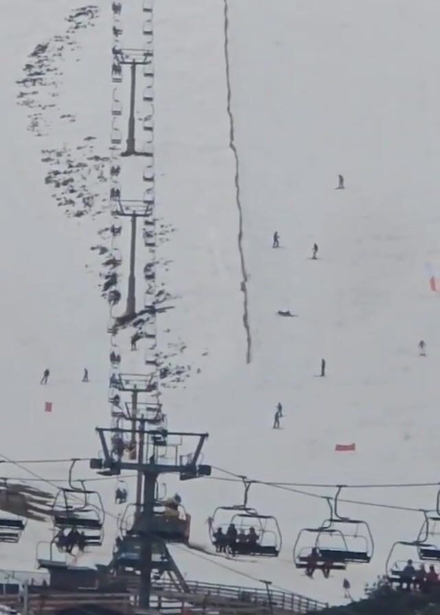 ski slope with a chairlift. Several people are skiing down the slope. The sky is overcast. The chairs on the lift are moving, some with people seated in them. A wooden fence is visible below the lift, and patches of bare earth are visible outside the snow-covered area.