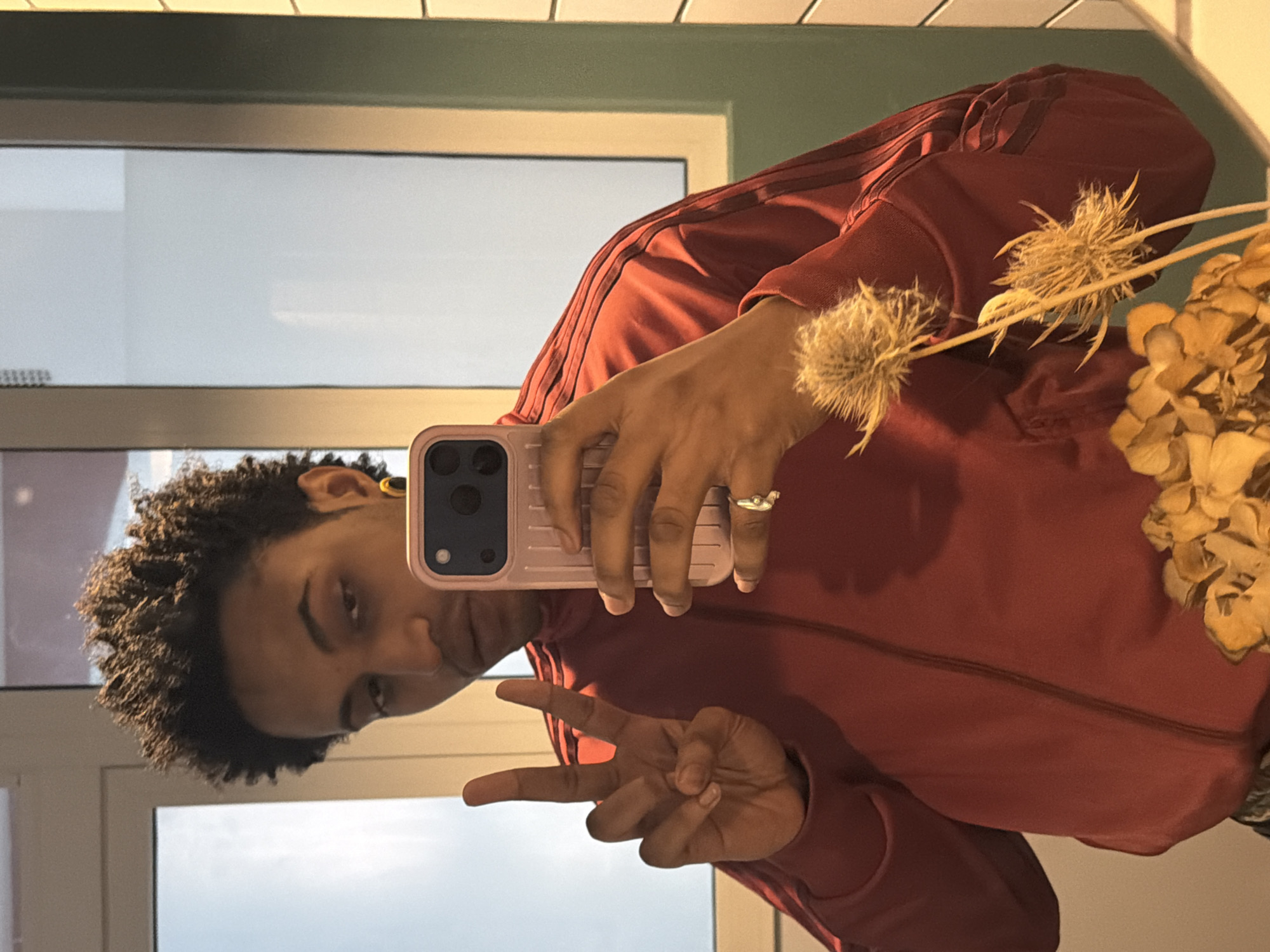 The image displays a reflection of an individual taking a selfie in what appears to be a mirror, located in Aubervilliers, France. The subject is a person with dark, curly hair and a medium complexion, wearing a red tracksuit jacket featuring dark stripes on the shoulders and sleeves. A yellow earring is visible in their left ear, and a ring is present on the ring finger of their right hand. The person holds a light pink smartphone with a visible multi-lens camera array in their right hand, angled towards the viewer. Their left hand is raised, forming a V-sign with the index and middle fingers. The subject's gaze is directed towards the camera, with a slight pout or smirk. In the foreground, at the bottom right of the reflection, a floral arrangement consisting of two dried, spiky thistle-like plants with pale stems and several dried, light brown, hydrangea-like flowers is present, positioned in front of the reflective surface. The background, visible as a reflection, includes a window or door frame in a light color, showing a bright, possibly overcast sky or a brightly lit interior beyond. To the right of this frame, a section of wall tiled with light green, horizontally-oriented rectangular tiles is visible. The entire scene is captured through a reflective medium.
