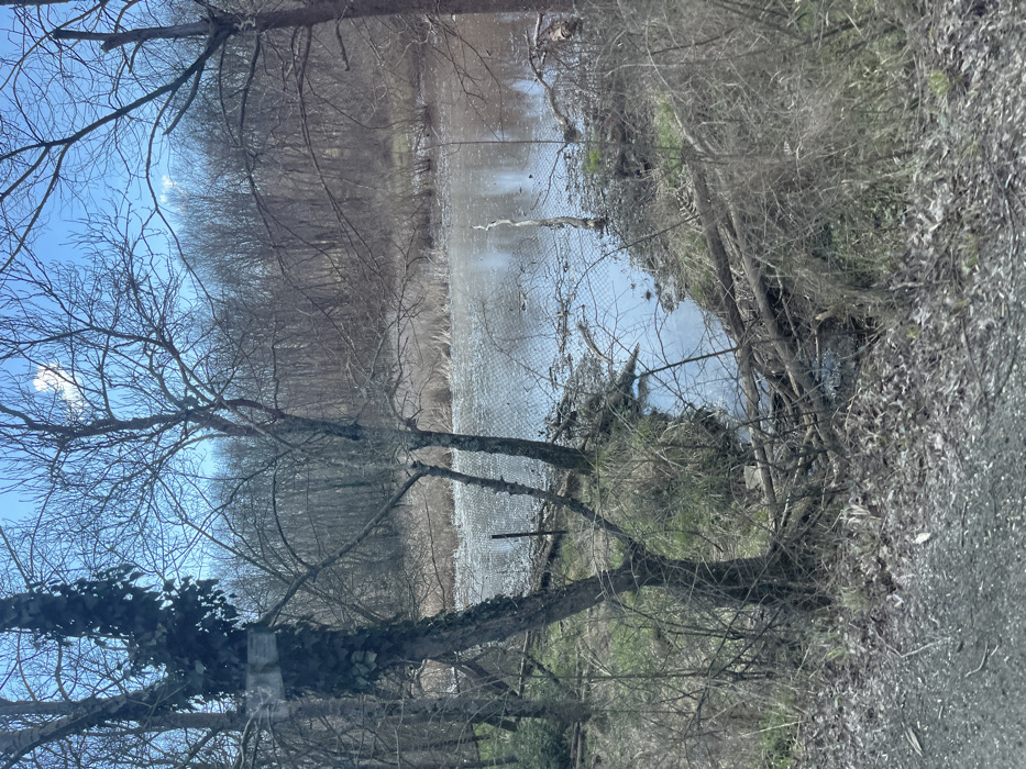 The image displays an outdoor scene in Primorsko, Bulgaria, dominated by a body of water and deciduous trees, indicative of a dormant season such as late winter or early spring. In the foreground, the lower left shows a dirt or gravel path partially covered with dry leaves and minimal green ground cover. To the right, dense, dry brush and fallen branches are present. Two prominent bare-branched trees frame the midground; the left tree is heavily entwined with dark green ivy. The midground features a pond or marsh with a somewhat reflective surface. A light-colored mesh fence or netting is visible partially submerged and stretching across a significant portion of the water, suggesting an artificial barrier or containment. Around the edges of the water, numerous fallen logs, branches, and dry reeds are scattered. The water's surface exhibits a slight sheen or film in areas. The background consists of a dense forest composed entirely of bare, leafless trees, primarily in shades of brown and grey. Above the tree line, a clear blue sky with scattered white clouds is visible. No individuals or active subjects are present in the frame.