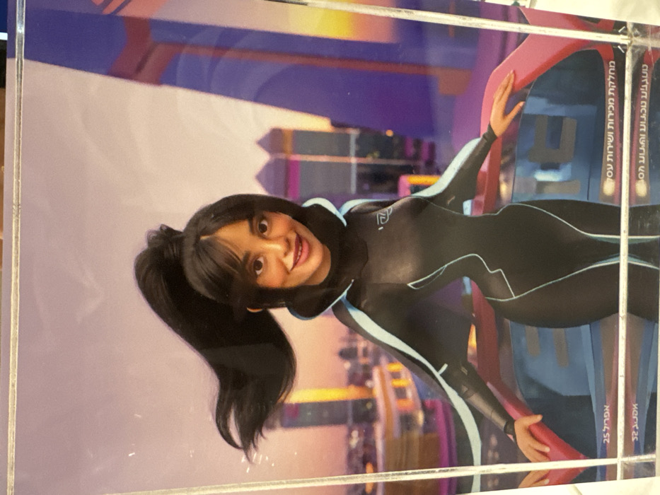 A cartoon image of a dark-haired woman with a high ponytail, wearing a black suit with light blue accents. She is standing on a red and blue platform against a cityscape backdrop with skyscrapers visible. The image appears to be a print or poster encased in a clear acrylic frame, with text visible at the bottom in Hebrew.