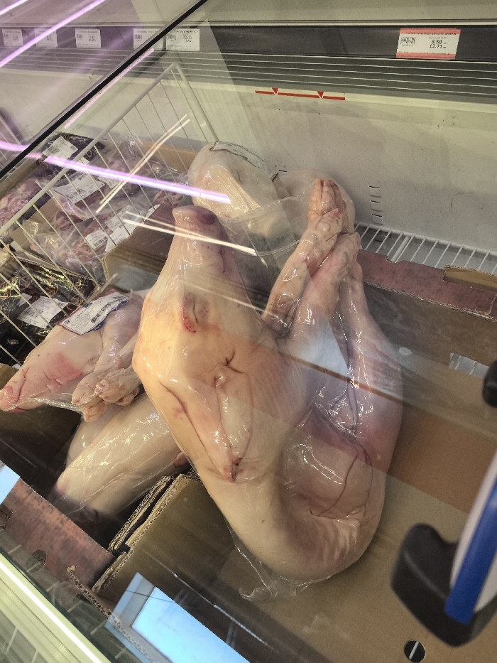 The image displays the interior of a commercial glass-fronted refrigeration unit, located within a retail establishment in Voluyak, Bulgaria. The primary subjects are multiple whole, eviscerated piglets, presenting a pale pink to beige skin tone, each individually vacuum-sealed in clear plastic packaging. These packaged piglets are contained within open, brown corrugated cardboard boxes, which are positioned inside the cooler. In the background, to the left, additional pre-packaged meat products are visible on white wire shelves. Price tags are affixed to the upper frame of the display case, with one clearly showing "6.50 / 12.71 BGN". Reflections on the glass surface include overhead artificial lighting and parts of the ceiling. A blue and black object is partially visible in the bottom right corner. No individuals or specific actions are depicted.