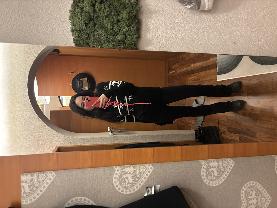 A woman stands in front of a mirror, taking a selfie with a pink phone. She is wearing a black sweater with white stars, black pants, and dark shoes. The mirror is framed by wood and has a rounded top. Behind her, the room features wooden walls, a circular object, and a lamp. Above the mirror, there is a green moss-like decoration. The floor is made of wood, and there is a patterned rug visible at the bottom. Additional footwear is scattered on the floor near her feet.