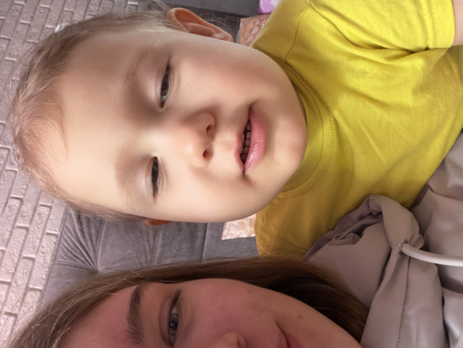 An indoor portrait features two individuals. On the left, the partial face of an adult female is visible, showing her left eye, cheek, and a segment of her mouth. She has light-colored hair and is wearing a light grey hooded garment with a visible white drawstring. Occupying the central and right portions of the frame is a young child, likely a toddler, with fair hair and a light complexion. The child's eyes are partially closed, and the mouth is slightly open, revealing a few upper and lower teeth. The child wears a bright yellow short-sleeved t-shirt. The background behind the subjects consists of a light-colored, brick-patterned wall, and a dark grey, tufted fabric element, possibly a headboard. Blurred patterned fabric, likely bedding, is also visible. This scene is located in the city of Chaikovsky, Russia.