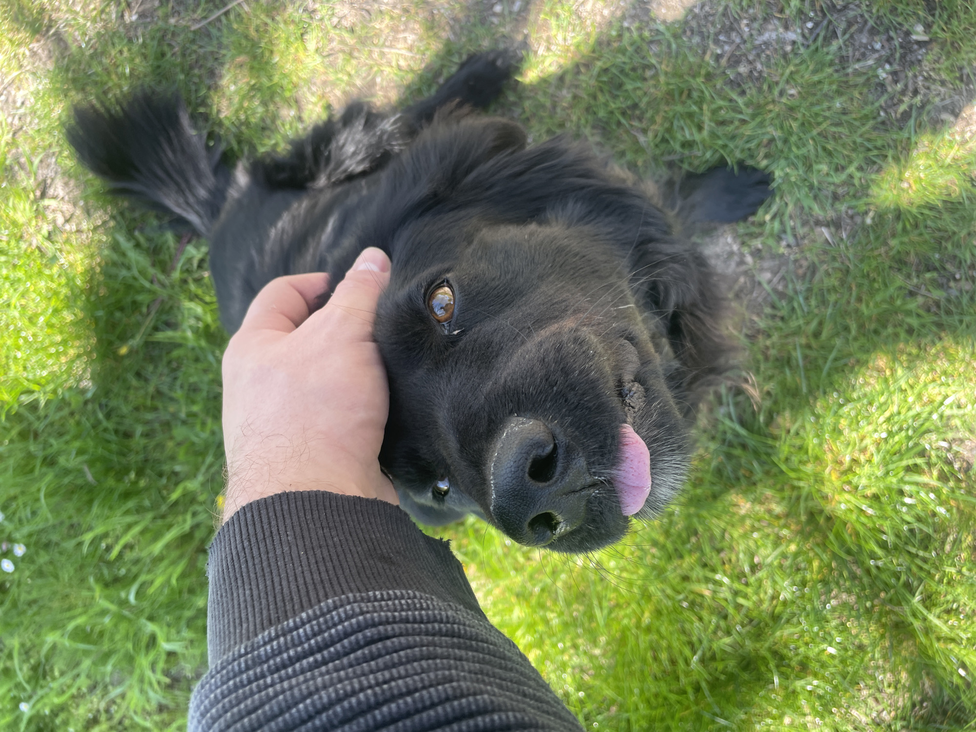 - "A black, fluffy dog is lying on its back in a grassy area, likely a yard or park, as indicated by the green grass" by FM-KDDwm2, licensed under CC BY 4.0