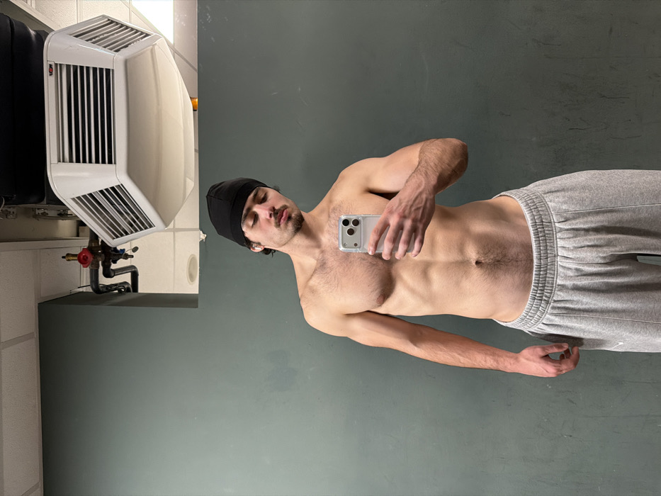 The image displays a mirror selfie of a male individual standing indoors