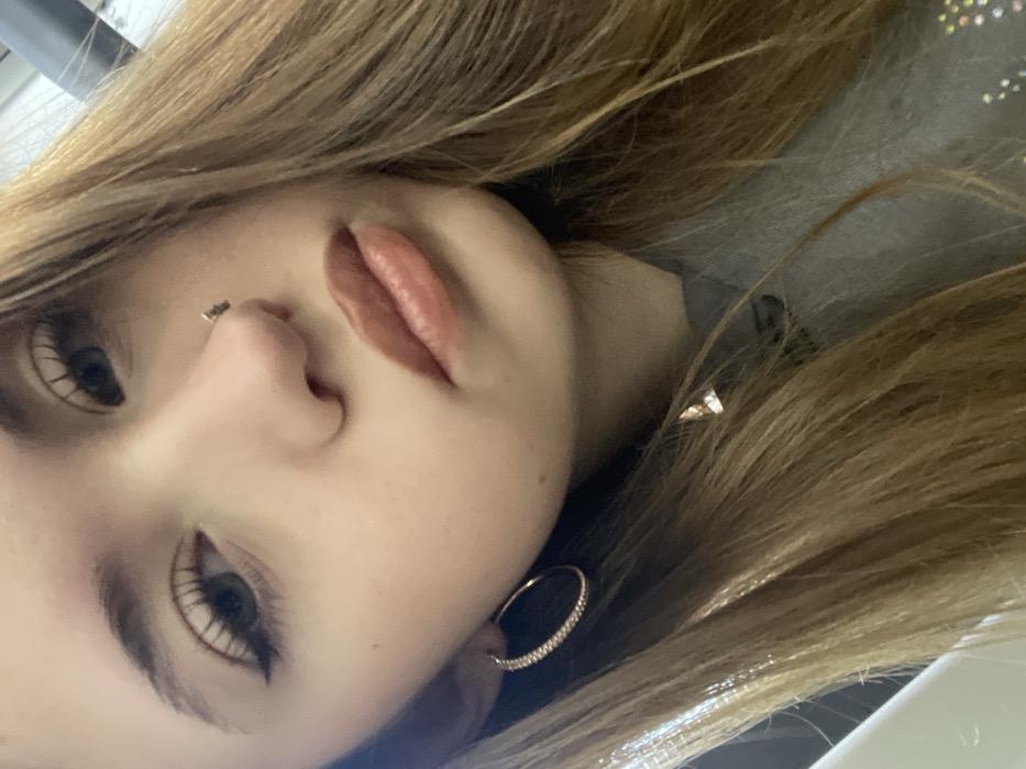 A close-up, tilted selfie depicts a young woman with light brown hair and fair skin. Her lips are painted with a muted rosy-brown color. She has dark eyelashes and a nose piercing. One large, sparkling hoop earring is visible. The background is blurred, hinting at a grey garment. The picture has soft lighting, enhancing the subject's features.