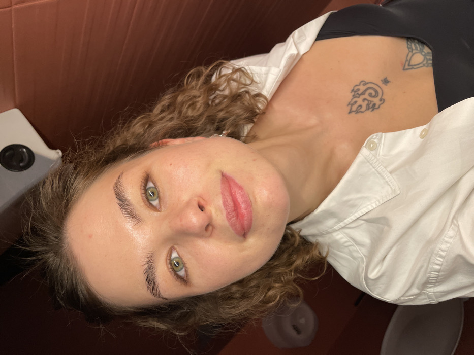 A woman with fair skin, curly blonde hair, and green eyes lies down. She is wearing a white, button-down shirt over a black top. Visible on her chest are two tattoos, one resembling a cloud and another geometrical design. The background is a dark, reddish-brown color. A white object with a black dial is partially visible in the upper-left corner. Another white object is partially visible at the bottom-right.