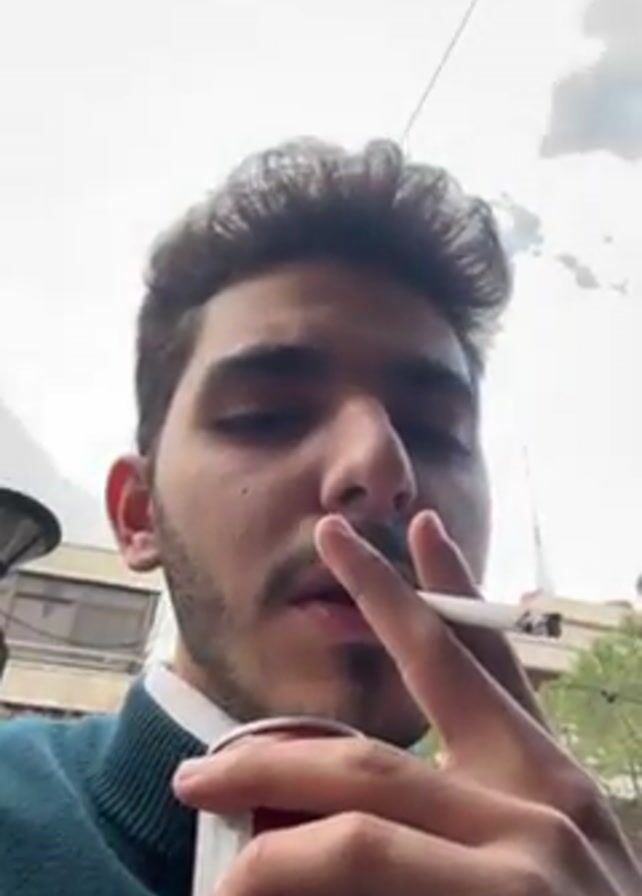 A young man is shown at a low angle, holding a lit cigarette and a can of Red Berry Ice Tea. He takes a drag from the cigarette and smoke is exhaled in front of his face. He is wearing a green turtleneck sweater over a collared shirt. The background shows a cloudy sky, buildings and trees.