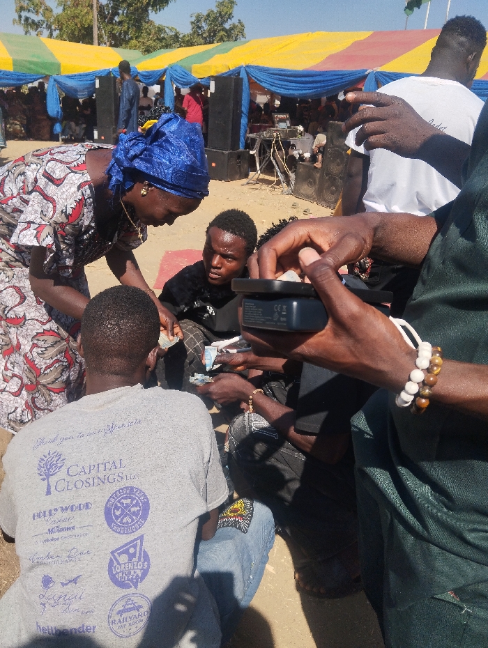 The image depicts an outdoor daytime scene in Idon, Nigeria, taking place on uncovered earth under a clear sky. A central group of individuals is engaged in an interaction involving currency and a small digital device. In the mid-foreground, a woman, identifiable by her blue patterned headwrap, gold-colored earrings, necklace, and a patterned long-sleeved dress, leans forward, extending her right hand downwards towards a seated group. Opposite her, a man in a black t-shirt is seated on the ground, holding a stack of currency notes in his left hand while looking towards the woman. Behind him, another individual is partially visible. To the left of the frame, a man is seated with his back to the camera, wearing a gray t-shirt featuring multiple white and purple sponsor logos and text, including "CAPITAL CLOSINGS llc." He wears blue jeans, possibly with a patch or rip on the left thigh. In the immediate foreground, the right arm and hands of an individual are prominent. This person wears three bracelets on their right wrist: two composed of white spherical beads and one of brown and black tiger eye beads. They are holding a small, black, rectangular digital device with both thumbs poised over its surface. A small, irregularly shaped white object rests on the device, suggesting a weighing or measurement action. In the background, a large outdoor canopy made of yellow, green, and blue fabric panels provides shade. Beneath this canopy, several large black audio speakers are positioned, along with what appears to be a sound mixing console and associated cables on a table, indicating sound amplification for an event. Additional individuals are visible standing and sitting further back under the canopy.