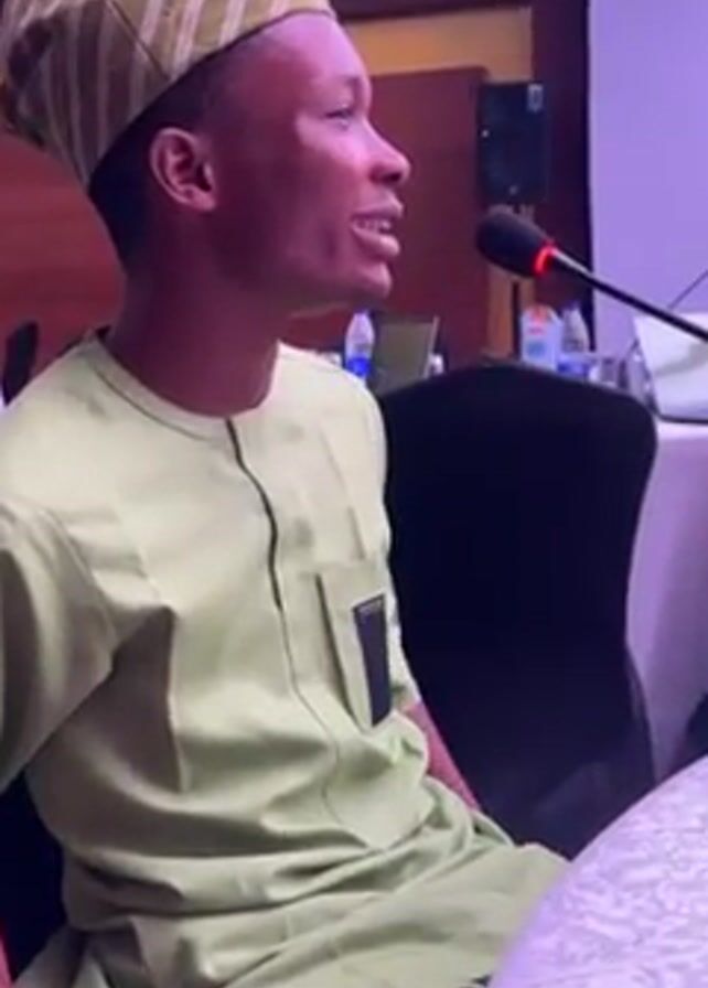 A young man wearing a green traditional outfit and hat is speaking into a microphone at a conference