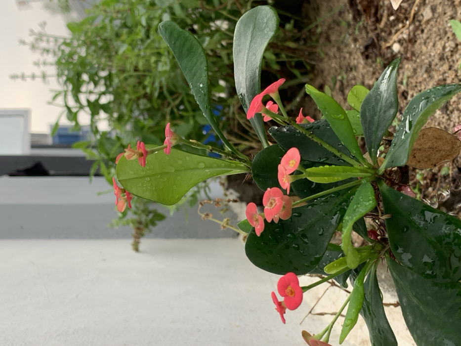 The image presents a close-up, ground-level view of a flowering plant situated outdoors in Ibasa, Nigeria. The primary subject is a plant, identifiable as a Euphorbia milii (Crown of Thorns), featuring dark green, ovate leaves and multiple clusters of small, vibrant coral-red bracts (commonly referred to as flowers) with minute yellow centers. Visible on the foliage and bracts are numerous spherical water droplets, indicative of recent precipitation or irrigation. The plant's stems display prominent thorns. To the immediate left and extending vertically is a plain, light-colored (off-white) wall structure. The background, largely out of focus, consists of dense green foliage from other plants or bushes, and faint, indistinct outlines of distant architectural structures under an overcast or diffused light sky. The ground beneath the main plant appears as dark brown soil. No individuals or active interactions are observed within the frame.