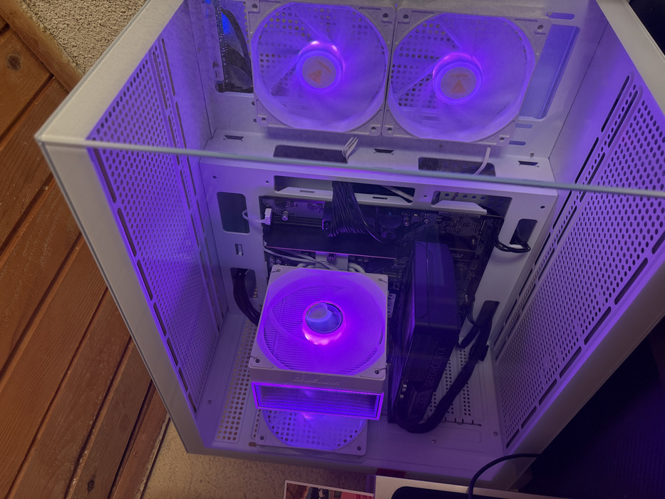 - "The image displays the interior of a white, modern personal computer (PC) case, illuminated by pervasive purple LED lighting" by FM-kr1G73, licensed under CC BY 4.0