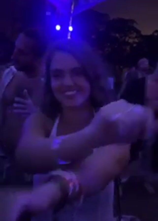 A woman dances at an outdoor music festival at night. She wears a white, crocheted dress, which is shorter in the front and longer in the back. She has a small black bag with silver studs on her shoulder. She moves her hands and smiles. Behind her, people dance shirtless or in casual shirts. Blue and white lights shine on them. The background shows trees and the outline of the venue.