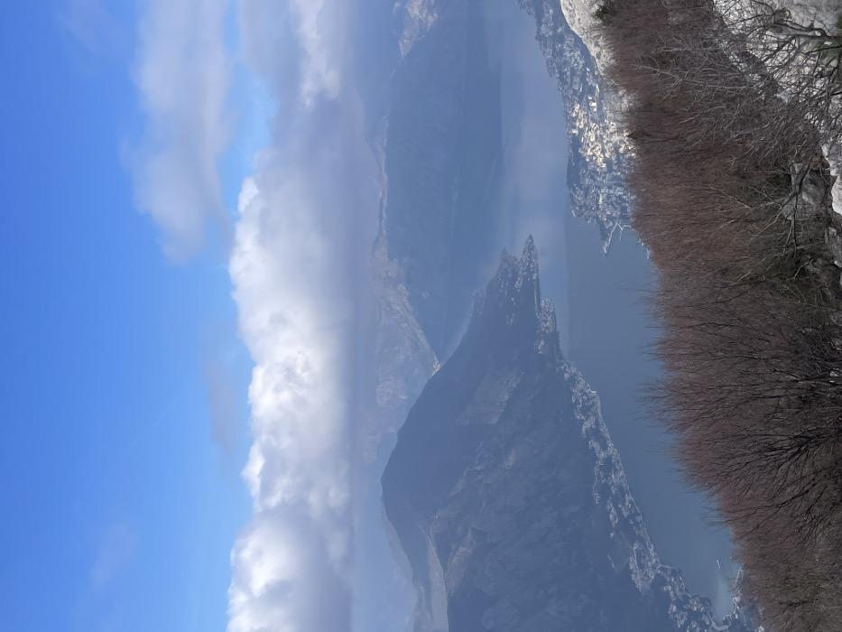 The image displays a panoramic, elevated view of the Bay of Kotor and its surrounding mountainous landscape, taken from an vantage point in or near Žanjev Do, Montenegro. The upper third of the frame shows a clear blue sky with scattered white cumulus clouds. A denser band of white and grey clouds extends horizontally across the middle distance, obscuring some mountain peaks. Below these clouds, dark, rugged mountainsides descend steeply towards a calm, deep blue-grey body of water, identified as the Bay of Kotor, which winds through the terrain. Numerous clusters of white and light-colored buildings, representing coastal settlements, are visible along the shores of the bay on both the left and right sides of the image. The immediate foreground on the lower right features sparse, leafless deciduous trees with dark, gnarled branches, interspersed with light-colored rocky ground. No individuals or active subjects are present in the scene.