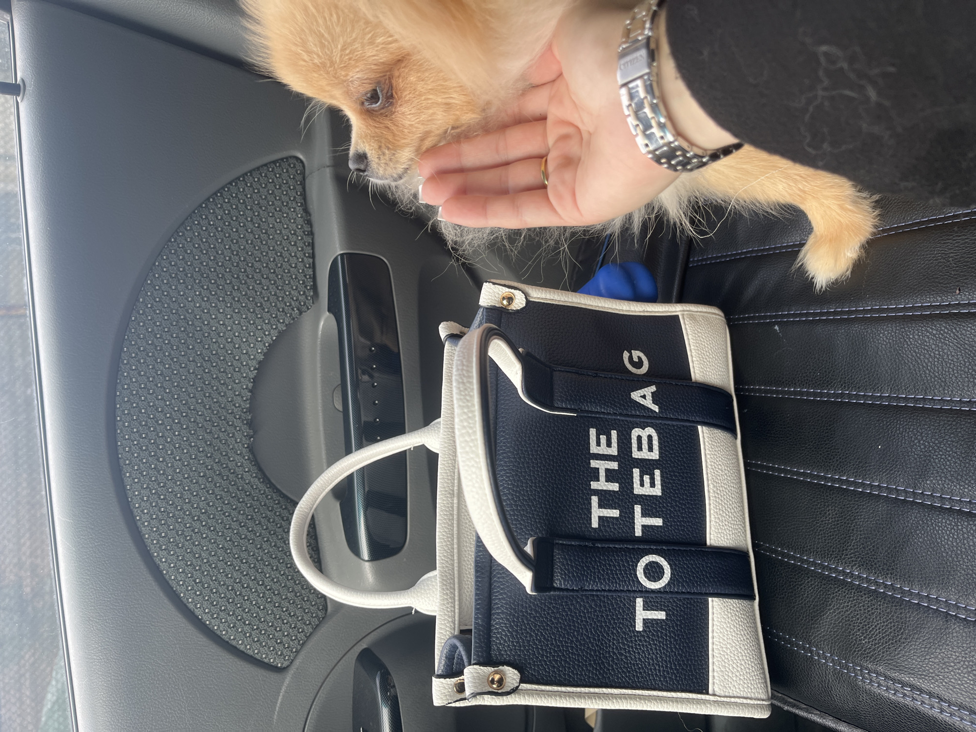The scene depicts the interior of a vehicle, likely a car. A small, light-orange colored dog, consistent with a Pomeranian breed, is positioned on the right side of the frame, facing left. A human left hand, adorned with a plain gold ring on the fourth finger and a silver-toned Citizen wristwatch on the wrist, is gently caressing the dog's chin and neck area. To the left of the dog, on a black leather car seat with visible white stitching, sits a navy blue and white structured handbag with the words "THE TOTE BAG" prominently displayed in white letters on its side. The bag features white handles and white trim. The background reveals the car's gray interior door panel, which includes a textured speaker grille with a grid pattern of small raised dots. Through the upper portion of the window, a blurry outdoor environment with muted light is visible, but no specific identifiable landmarks or features are present to determine a precise location within Sofia, Bulgaria, or any other city. The action involves human-animal interaction within a confined vehicle space.