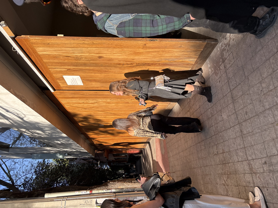 Three women are standing outside a building with a wooden facade. One wears a tiger-striped top and black pants. Another is dressed in a black outfit with a long skirt and chain detailing. The third woman is wearing white pants, loafers, and a black jacket. They appear to be posing or taking pictures. A person in a plaid jacket is also standing nearby. The setting appears to be an urban area with trees visible in the background.