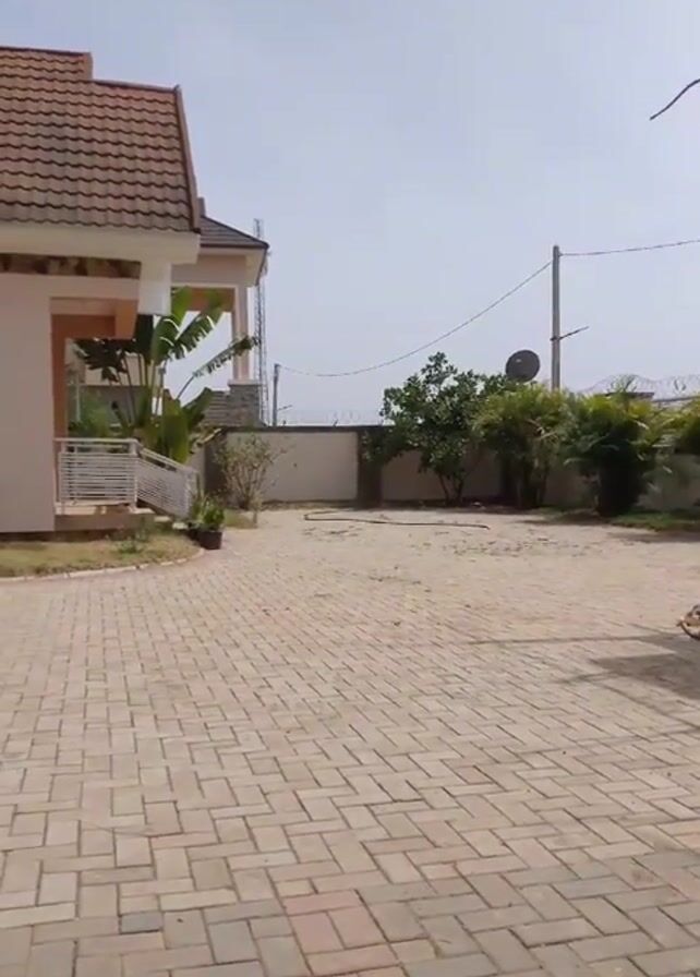 paved driveway leading up to a single-story house with a reddish-brown tiled roof. The house is painted a light peach color, and there's a small porch area with white railings and some greenery. A small evergreen tree sits to the left of the porch. In the background, there's a concrete wall topped with barbed wire, behind which are some trees and a satellite dish. Power lines are visible in the sky. The paving is made of rectangular bricks arranged in a pattern. The sky is overcast and the overall lighting is bright. No people are visible in the scene.