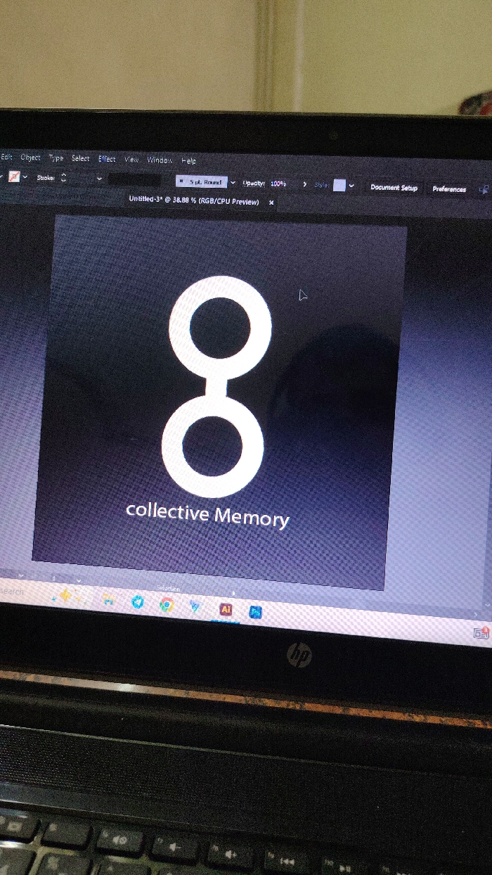 A laptop screen displays Adobe Illustrator. The program is open to a document titled "Untitled-3* @ 38.88% (RGB/CPU Preview)." The design in focus is a stylized logo featuring two stacked white circles connected by a thin line, resembling the number eight. Beneath the logo, the text "collective Memory" is written. The program menus such as "Edit," "Object," "Type," "Select," "Effect," "View," "Window," and "Help" are visible at the top. The taskbar is visible at the bottom of the screen.