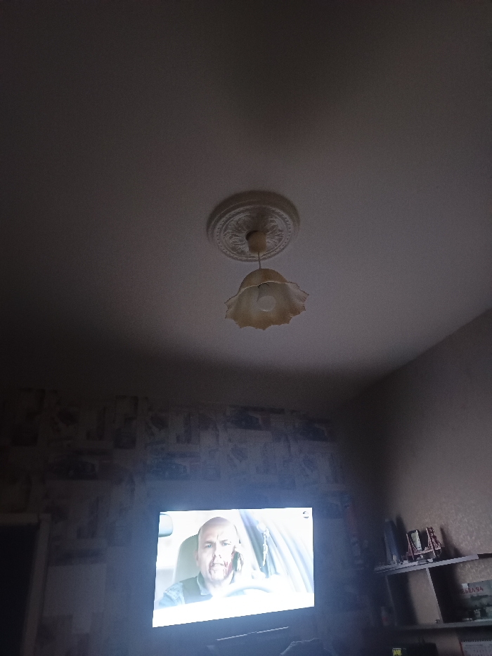 The image depicts an indoor scene within a room located in the city of Dobrich, Bulgaria. The upper portion of the frame shows a light-colored ceiling with a central, decorative white ceiling medallion from which a single ceiling light fixture hangs. The fixture consists of an off-white, ruffled or flower-shaped glass shade containing a visible light bulb. Below the ceiling fixture, a wall covered with wallpaper featuring a collage-like pattern of text and images in muted tones is visible. In the lower-center of the frame, a bright flat-screen television is illuminated, displaying content. The screen shows a male individual, appearing to be bald or with very short hair, with a visible injury or blood on the left side of his face, extending from the temple towards the cheek. He is wearing a dark vest or jacket over a lighter garment and is positioned inside what appears to be a vehicle, with a steering wheel and parts of the car interior visible in the background. To the right of the television, a plain light-colored wall is visible, on which a white wall-mounted shelf system is installed. The upper shelf holds several indistinct objects. The lower shelf displays an item labeled "EA SPORTS FIFA 94." A dark, vertical object, possibly a doorway or furniture, is partially visible on the far left of the frame. The overall lighting in the room is dim, primarily illuminated by the television screen.