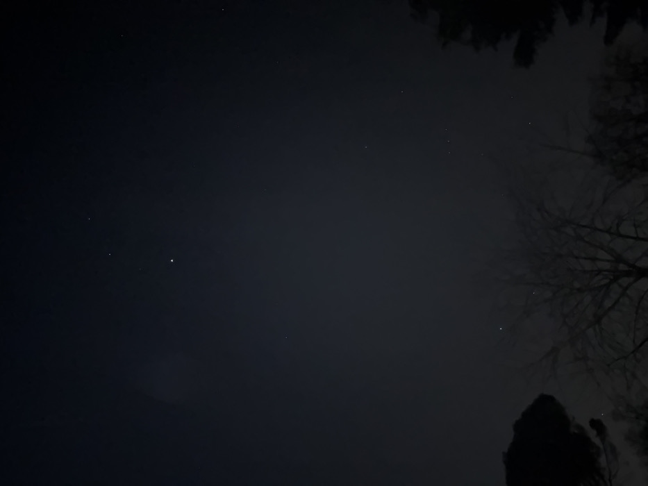 A night scene showcases a dark, expansive sky dotted with scattered stars. The faint constellation hints at clear conditions. In the lower right, silhouetted trees with bare branches reach upwards, framing the sky. A darker mass at the bottom center suggests the presence of either foliage or rock, while the upper edge reveals the blurred outlines of a forest canopy. The overall impression is one of tranquil darkness.