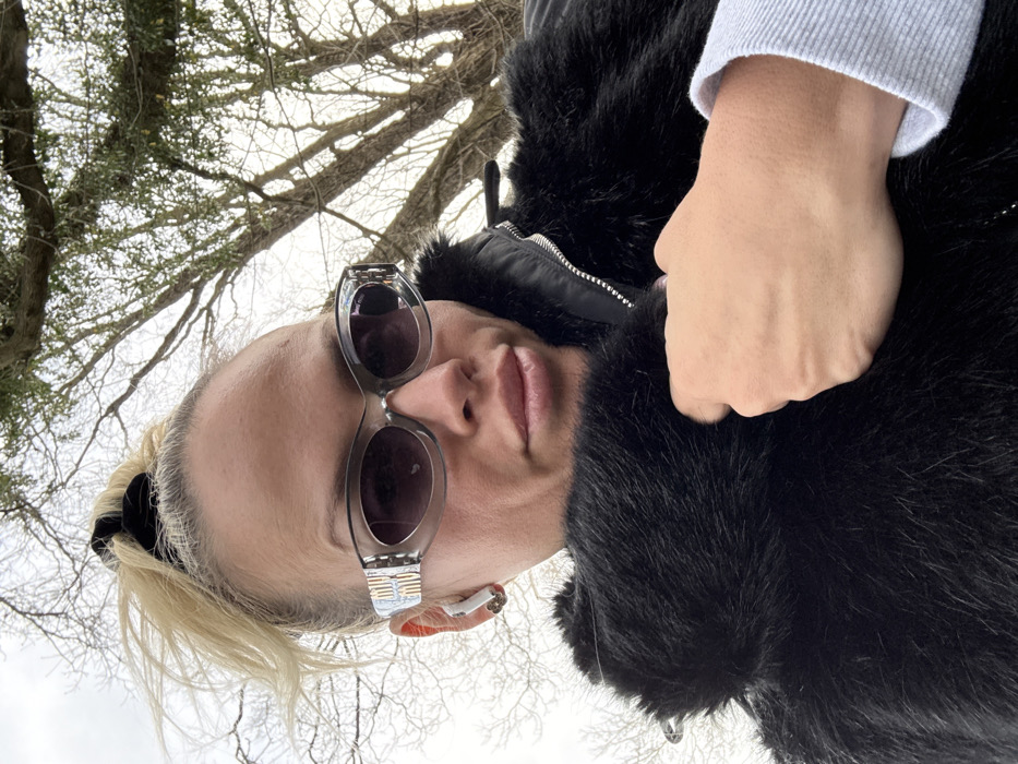 A female subject is depicted from the chest up, positioned against an outdoor background. Her blonde hair is pulled into a high ponytail, secured with a black scrunchie. She wears dark, oval-shaped sunglasses with translucent grey frames; "MIU MIU" branding is visible on the left temple arm. A white wireless earbud is present in her left ear, along with a small, light-colored, possibly floral-shaped earring. She is dressed in a black faux fur coat over a black padded jacket, indicated by a visible silver zipper beneath the fur. Her right hand, showing a light grey ribbed sleeve on the forearm, is grasping the faux fur collar of her coat. The background consists of a light, overcast sky and bare tree branches, suggesting a colder season. The scene is located in Crawley, United Kingdom.