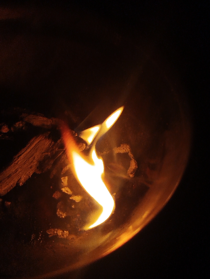 A forensic close-up image depicts a contained combustion event. A prominent, undulating flame, radiating yellow and orange light, is centrally positioned within a dark environment. To the left and beneath the flame, irregular, dark solid fuel fragments, consistent with wood or charcoal, are observed. The fire is contained within a circular, reflective vessel, likely metallic, visible along the right and bottom edges, which reflects the flame's luminescence. Scattered particulate residue is present on the vessel's interior surface. The background is black, indicating complete darkness. No human subjects or their actions are discernible. The scene is situated in Keffi, Nigeria.