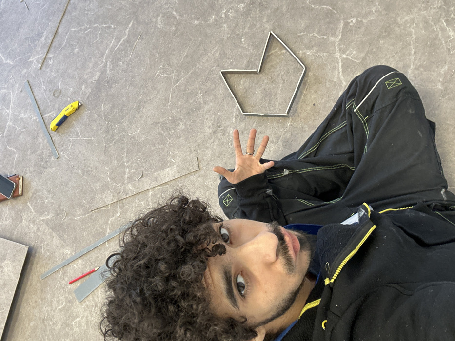 A young adult male, with dark, curly hair, a beard, and a mustache, is depicted in a high-angle view, appearing to be seated or kneeling on a grey, marbled floor in Wissous, France. He wears a black hooded jacket with yellow zipper and trim, and black work trousers with light-colored stitching. His right hand is raised with fingers splayed, a ring is visible on his left ring finger. His gaze is directed forward at the camera. Scattered across the floor are various objects: a yellow and blue utility knife, a red pencil, a black hair tie, multiple grey rectangular strips of material consistent with flooring, two smartphones (one with a brown case), and a distinct metallic, open, angular shape resembling an arrow or incomplete house outline. Small debris and shavings are visible on the floor, indicative of cutting or installation work.