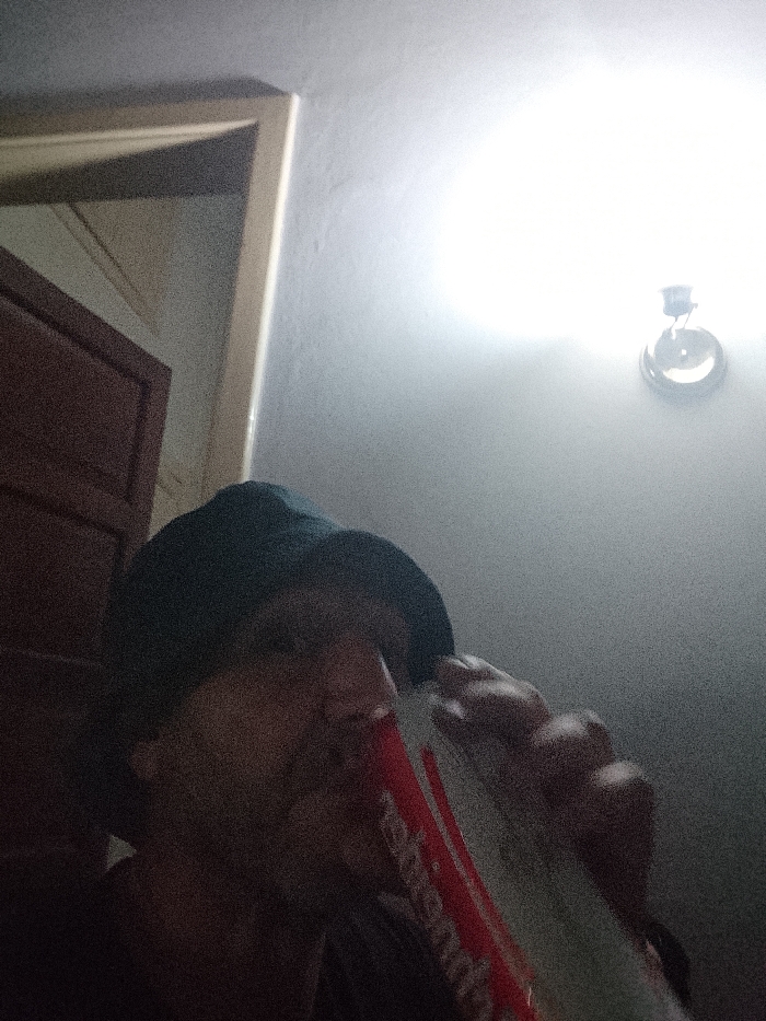 The image depicts an individual in an indoor setting within the city of Unknown, Unknown. The person, whose facial features and specific characteristics are largely obscured by shadow and the angle, is seen from a slightly upward perspective, wearing a dark beanie or cap. They are holding a white can with a prominent red stripe and partially visible reversed text (resembling "BUDWEISER") to their mouth, indicating consumption of its contents. The individual's right hand is visible gripping the can. In the upper left background, a dark brown wooden door is partially visible within a lighter-colored doorframe. The rest of the background consists of a light-colored wall. A wall-mounted light fixture, appearing circular and metallic, is positioned on the right side of the wall, emitting intense illumination that creates a significant glare in the upper right quadrant of the scene.
