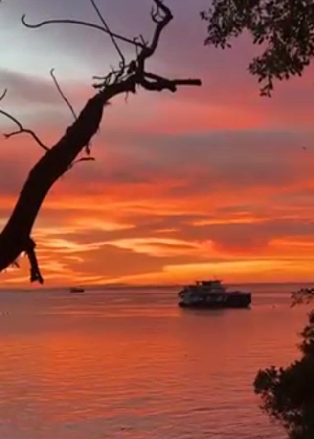 vivid red and orange sunset over the ocean, partially framed by trees. The sky is filled with streaks of fiery colors, and the water reflects the vibrant hues. Several boats, including a larger ferry-like vessel, are visible on the water. The camera angle appears to be from an elevated position, looking out over the sea.
