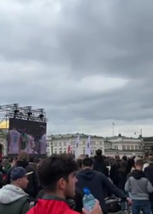 large crowd of people gathered in a public square. A large screen is visible, displaying a video of people interacting. Many people are looking at the screen. Some individuals are holding Bulgarian flags. A young boy is seen sitting on someone's shoulders. The architecture of buildings is visible in the background. The sky is overcast.
