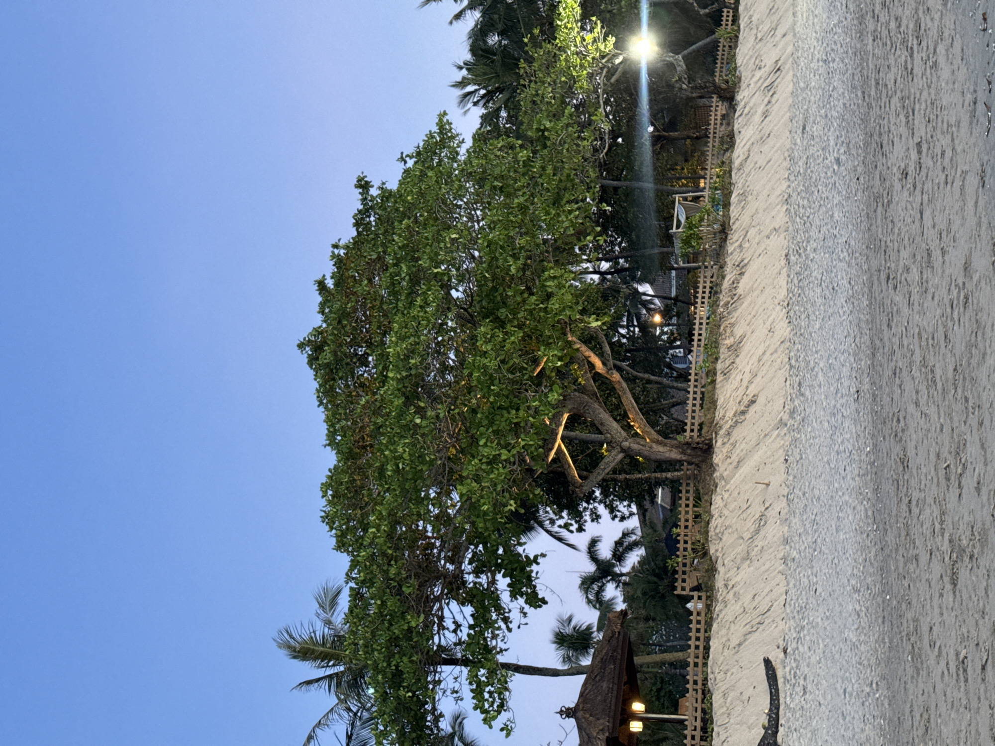 The image captures a beach scene in Jimbaran, Indonesia, at dusk or dawn. The foreground features a sandy beach, with the tide far out. A gnarled tree stands prominently, its branches heavily laden with green foliage. A wooden fence runs along the edge of the beach. A small building or shelter is partially visible beneath the tree, with lights illuminated. Palm trees are scattered in the background against the blue sky. A bright light source shines through the trees, likely a street lamp.