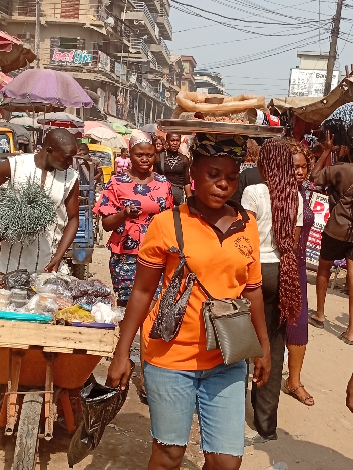A bustling African street scene shows numerous people among stalls and commercial buildings. A woman in the foreground, wearing an orange polo shirt and denim shorts, carries a black bag in her left hand and a small crossbody bag. A tray with goods is balanced on her head. To her left, a man stands next to a cart loaded with produce. Behind her, other pedestrians, including a woman in a red floral top and another with long braids, navigate the crowded space. Overhanging signs for "bet gia" and "Bana" are visible, suggesting a market atmosphere.