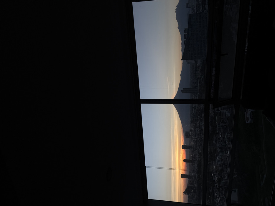 The image displays an elevated view of the cityscape of Puebla City, Mexico, at sunset, observed through a window. The scene is dominated by a clear horizon featuring a large, conical volcano, likely Popocatépetl, situated slightly right of center, silhouetted against the twilight sky. To its right, an additional mountain range is visible. The sky exhibits a gradient: a vibrant orange-yellow glow is concentrated at the horizon on the left, indicative of a sunset, transitioning to light blue, then a darker blue overhead and to the right. Below the mountains, the sprawling urban environment of Puebla City is visible, characterized by numerous buildings, including several dark, modern high-rise structures, particularly prominent in the mid-left and far right. The city's residential and commercial zones extend into the distance. The vantage point is from a high-rise building, likely located in modern areas such as Zona Angelópolis or Lomas de Angelópolis, looking towards the west. The immediate foreground and upper portion of the image are dark, framing the view through a window with a visible vertical mullion and a horizontal dark sill or railing at the bottom. No individuals or specific actions are discernible. The indoor environment is underexposed, rendering it mostly dark and featureless.