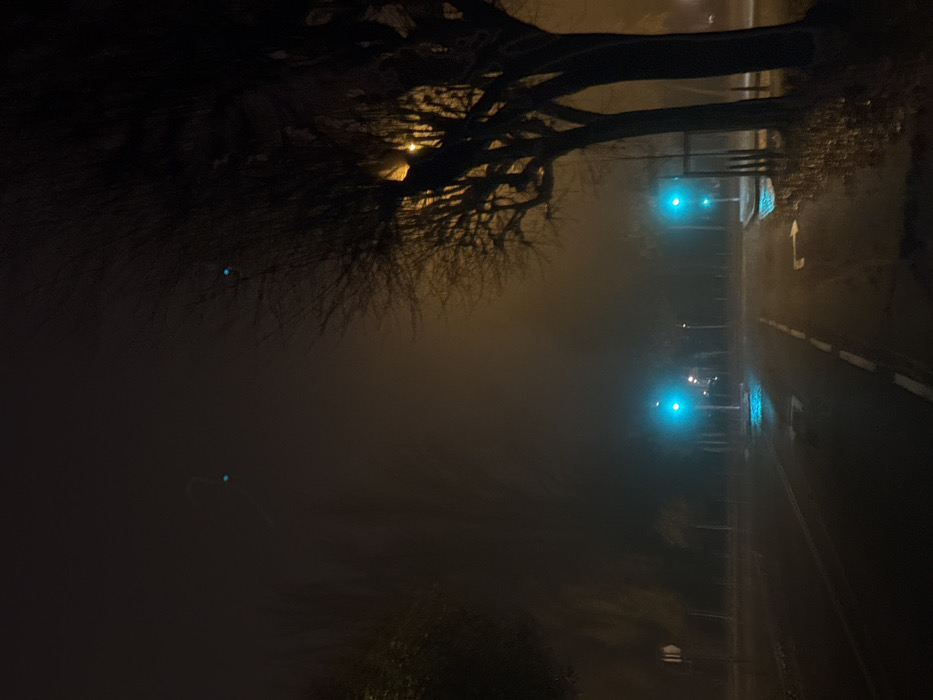 Night scene with a road running horizontally. Two sets of blue lights are visible on the right side, suggestive of street lamps. Bare branches of a tree extend across the top. Fog or mist obscures the background, creating a hazy atmosphere. A street sign with an arrow is beside the road. The left side is predominantly dark and unclear, with a faint light point in the upper-left. The image is rotated clockwise.