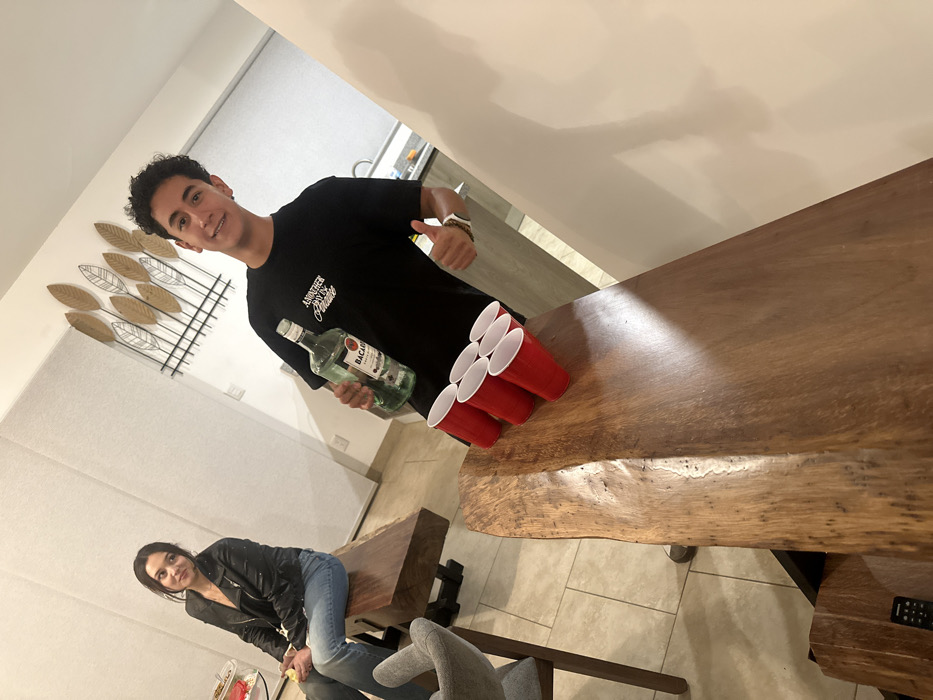 The scene is an indoor setting, identified as being in the city of Zibatá, Mexico, likely within a modern residential space. A young adult male, with dark curly hair and wearing a black t-shirt with white text and a white watch, stands in the midground. He holds a clear glass bottle of Bacardi rum in his left hand and gives a thumbs-up with his right hand, while looking towards the camera with a slight smile. To the left background, a young adult female with dark hair is seated on a thick, dark wooden bench. She wears a black leather jacket over a light top and blue jeans, and is looking towards the male subject. In the immediate foreground, on a live-edge wooden slab table, six red plastic cups are arranged in a triangular formation, consistent with a beer pong setup. The flooring consists of light-colored tiles, and the walls are predominantly light-toned. A metallic wall decoration featuring multiple leaf-like shapes is mounted on a wall in the background. A black remote control is visible on a lower wooden surface in the bottom left corner. A modern kitchen area with a sink and light-colored countertops is partially visible in the right background.