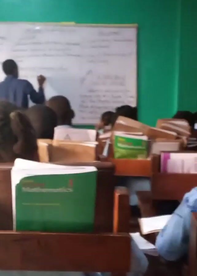 n indoor classroom scene, likely in a school setting. A teacher is standing at a whiteboard, writing with a black marker, his back to the camera. Several students, wearing blue school uniforms, are seated at wooden desks, some with books and notebooks open in front of them. A green "Mathematics" textbook is visible on the desk in the foreground. The room is painted with a green wall behind the whiteboard.