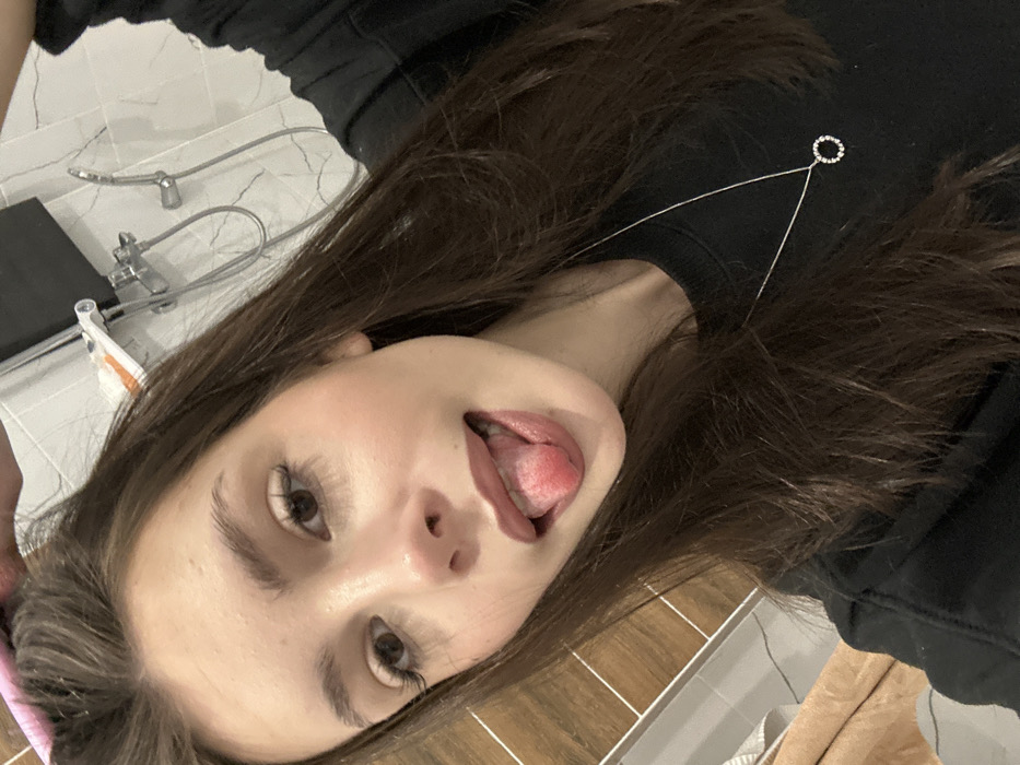 The image depicts a young female subject taking a selfie in what appears to be a bathroom in Novosergievka, Russia. The subject has long, dark brown hair, with a pink hair roller visible at the top of her head on the left. She is wearing a black long-sleeved top and a silver-colored necklace with a small, circular, pavé-set pendant. Her eyes are directed towards the camera, and her mouth is open with her tongue extended, displaying a textured surface. Makeup is present, including apparent eyeliner or mascara, and lip color. The background features light-colored wall tiles on the right, displaying a grey-white marbling pattern, with a chrome shower mixer faucet and a handheld showerhead mounted on a rail. A small white shelf is positioned above the faucet. On the left side of the frame, brown rectangular wall tiles are visible, along with a partial view of a light-colored towel.