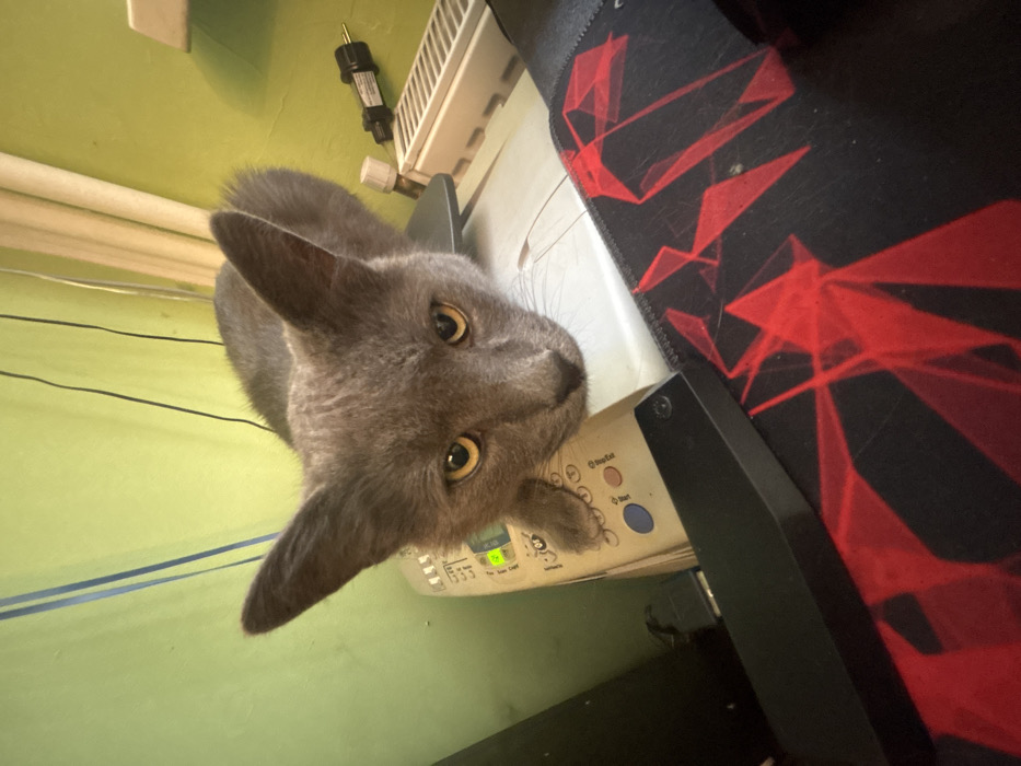 - "A domestic short-haired cat with solid grey fur and amber eyes is positioned on top of a white multifunction printer or scanner" by FM-OMThs2, licensed under CC BY 4.0