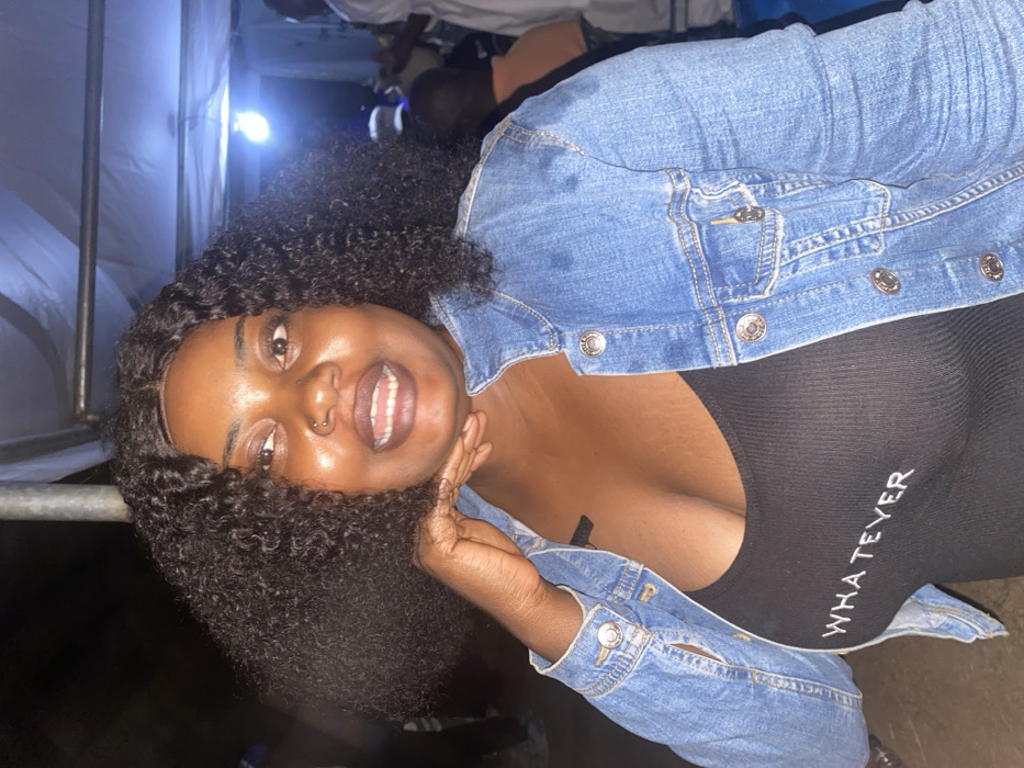 A woman poses in a candid shot, wearing a denim jacket over a black top with "WHATEVER" printed on it