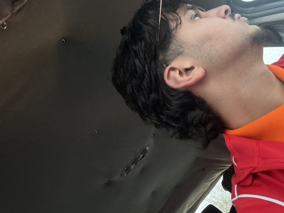 The scene is situated within the interior of a vehicle in Illkirch-Graffenstaden, France. A male individual is presented in a right-side profile, occupying the lower-center and right portions of the frame. He exhibits dark, wavy hair styled with a fade on the side and longer growth at the nape. Thin, gold-colored eyeglass frames are visible, resting on his right ear and temple. The individual has facial hair, consistent with stubble or a short beard, along his jawline and chin. He is dressed in an orange collared shirt beneath a red jacket with white piping along the collar and the left shoulder area. His head is oriented towards the right, suggesting observation through a vehicle window, a blurred section of which is visible on the far right and left, showing a light-toned exterior. The upper two-thirds of the image display a dark-colored vehicle headliner, marked by multiple indentations and several circular fasteners. No specific actions or interactions are depicted beyond the subject's pose and gaze.