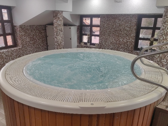 The image displays an indoor hot tub room located in Dobrinishte, Bulgaria