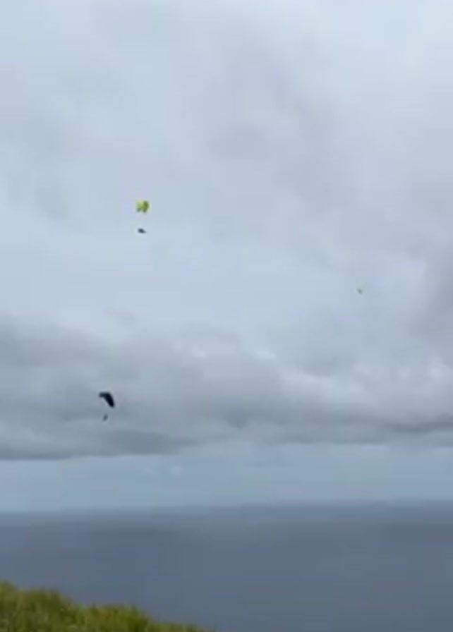The video depicts three paragliders soaring against a backdrop of a cloudy sky and a vast ocean
