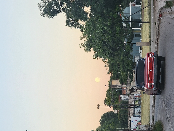 A red classic car is parked on the side of a street, viewed from behind. The setting sun is visible in the sky, casting a warm glow. Trees line the street, and some buildings are visible in the background. The car's chrome accents gleam in the sunlight. The scene evokes a nostalgic and peaceful atmosphere.
