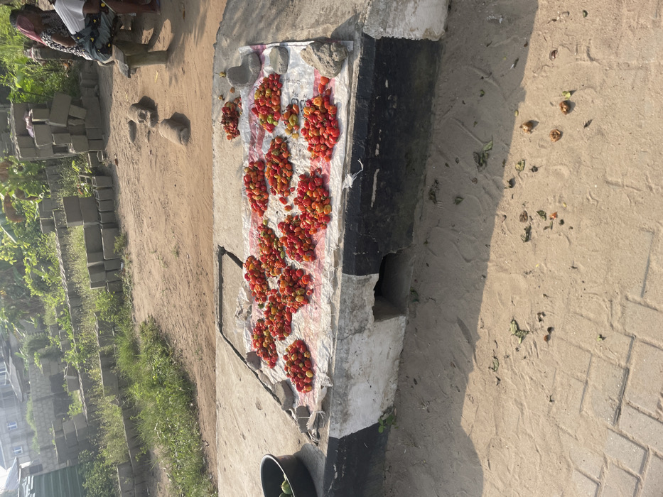 The image depicts an outdoor market scene in Itoga, Nigeria, under bright daylight. In the foreground, a raised concrete structure, painted with black and white stripes, serves as a display surface. Spread across this structure on a white plastic tarp are approximately a dozen distinct piles of red and orange Habanero or Scotch Bonnet peppers. To the left, a black plastic bowl contains green, unripe produce, while two small grinding stones are visible on the tarp near the peppers. The immediate ground is unpaved, sandy earth with scattered organic debris and a section of interlocking brick pavement in the lower left. In the midground, two individuals are partially visible, seated on a low concrete bench on an unpaved dirt patch. Behind them, numerous stacks of grey concrete blocks are arranged within an overgrown field. Residential buildings and lush green foliage complete the background under a clear sky.