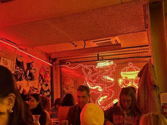 The image depicts an interior scene within an establishment located in Paris, France, characterized by a dominant red lighting scheme. The setting appears to be a bar or restaurant, illuminated primarily by red neon lights. The environment features textured walls and a textured ceiling, both intensely bathed in red light. A prominent horizontal red neon strip light runs along the left wall. Below it, several dark, fabric-like decorative hangings, possibly flags or stylized boxing shorts, are affixed, some displaying indistinct white text. In the mid-ground, a large, intricate red neon sign portraying a swirling, abstract, or dragon-like motif is visible behind a metal grid. To its immediate right, a yellow neon sign outlines a figure wearing a distinct hat, suggestive of an Asian cultural design. An air conditioning unit and a wooden beam are visible on the ceiling above these signs. Several individuals are present, seated and partially visible. In the extreme foreground on the left, the back of a person's head with dark hair and an earring is shown. To their right, a woman with dark hair, wearing a dark top, is seen in profile, looking towards the right. Centrally, a man with short, dark hair and a dark shirt is looking downwards and slightly to his left. Further right, a woman with glasses and light-brown hair, wearing a dark sweatshirt with "OLD COAS" partially legible, is looking down at a surface in front of her. Additional blurred figures are visible in the background, seated. On the far right, a fuzzy brown garment hangs from a vertical structural element, and a white rectangular unit with a red button is mounted on the adjacent wall. Individuals appear to be engaged in social activity or dining.