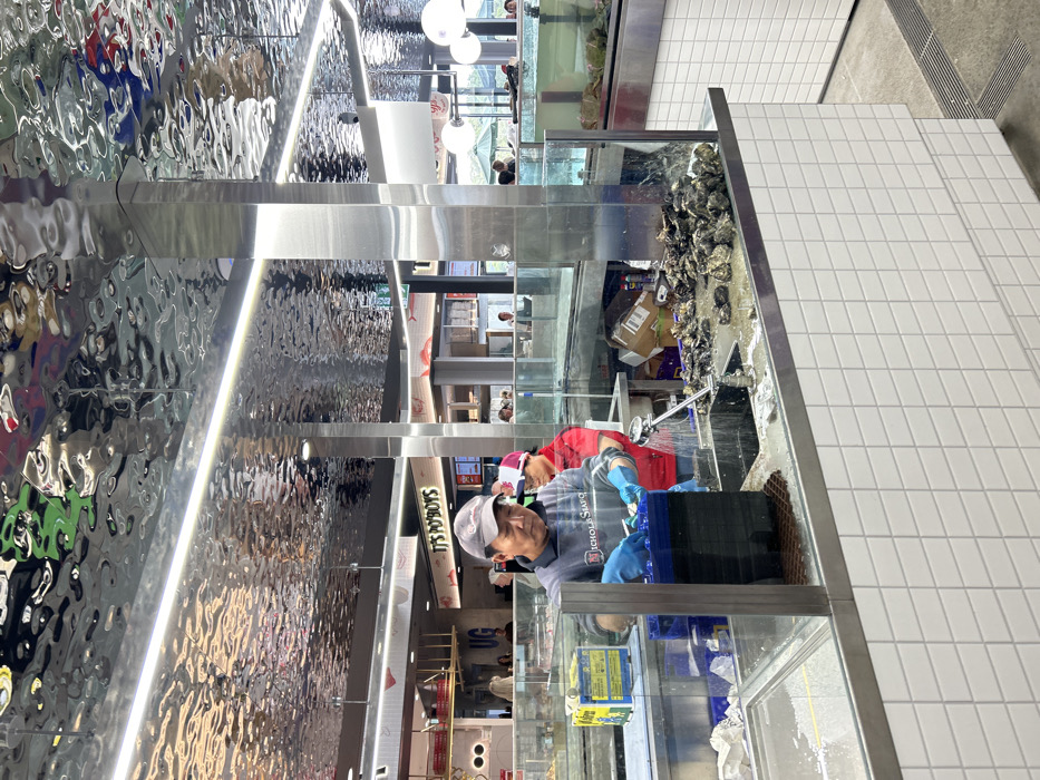 - "A restaurant worker in blue gloves stands behind a glass-enclosed oyster display, washing oysters under a running faucet" by FM-Ewbxn2, licensed under CC BY 4.0