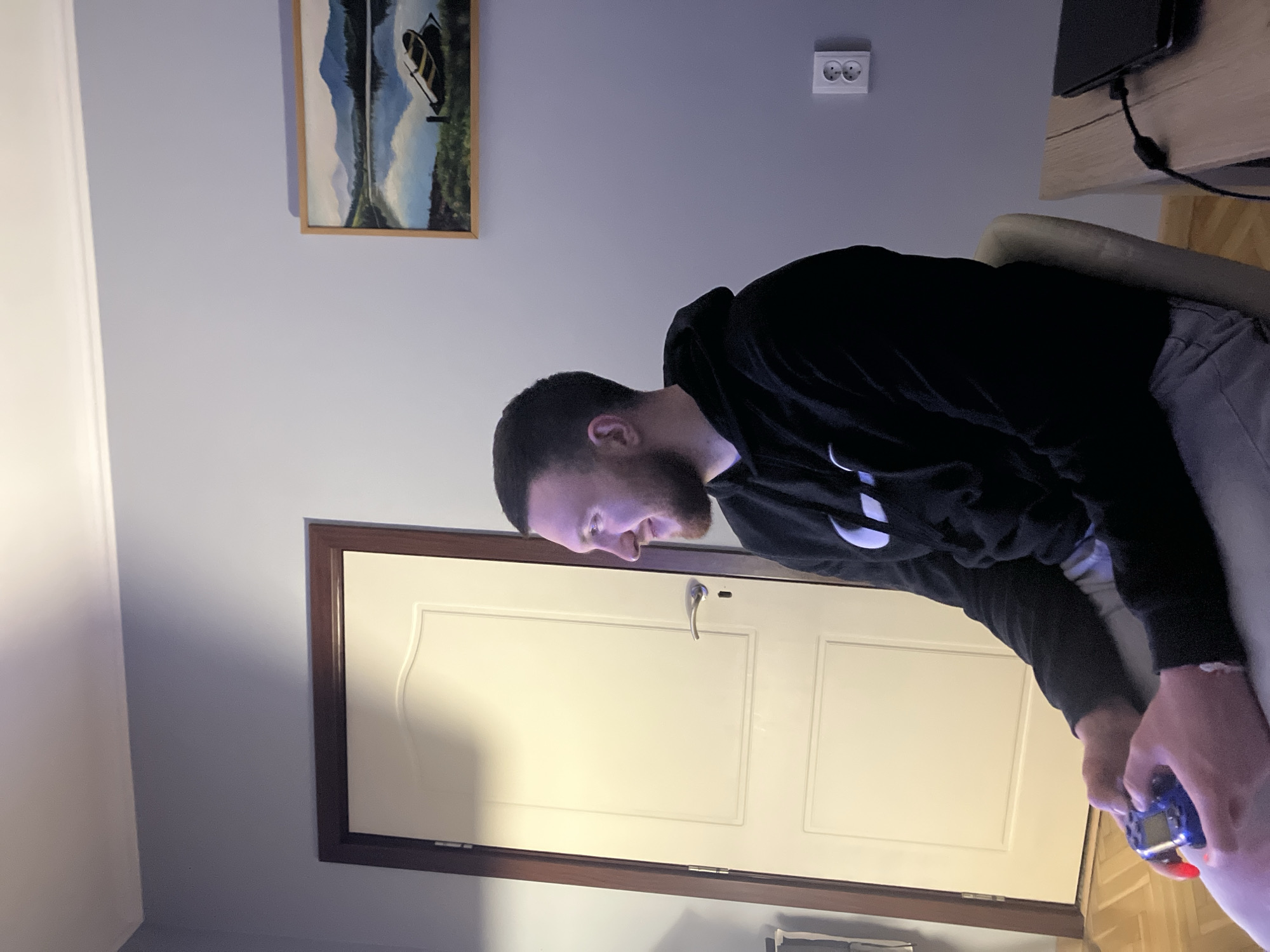 This image depicts an indoor residential scene in Karlovo, Bulgaria. A male individual, appearing to be in his 20s or 30s with a beard and dark hair, is seated on a light-colored chair, facing left from the viewer's perspective. He is wearing a black hooded sweatshirt with a white logo on the chest and light-colored trousers. His hands hold a blue and white gaming controller. The male subject has a slight smile and is looking towards the left, outside the frame. In the background, to the left of the male, a white door with a dark brown frame and a silver handle is visible. A light-colored wooden parquet floor is present in the lower left. To the right of the male subject, a framed landscape painting hangs on a light blue-grey wall. The painting depicts a serene lake with distant mountains, reflected in the water, and an overturned rowboat on the grassy shore. Below the painting, a white dual power outlet is mounted on the wall. A light-colored wooden table is partially visible on the far right, with a black laptop and a connected charging cable. The ceiling is white with a decorative molding along the wall junction.