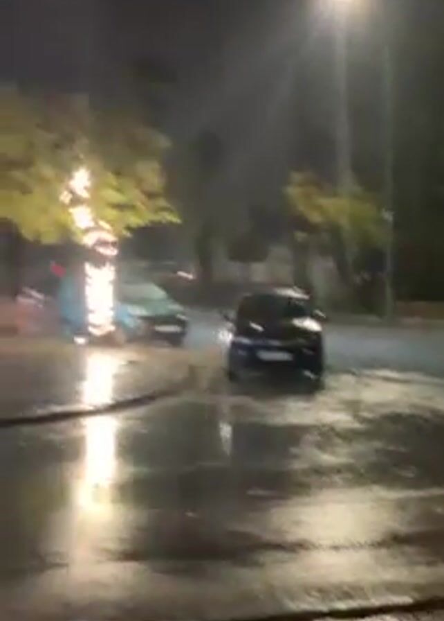 wet, rainy street scene at night. The street is slick with water and illuminated by streetlights and the lights from nearby businesses. Several cars are visible, including a dark SUV driving towards the camera in the beginning. The camera pans to show storefronts, including a clothing store named "CAPITANO" and another store with a sign that appears to say "Dar D'Zara." There are parked cars along the side of the street. A tree decorated with lights stands on the corner of the street.