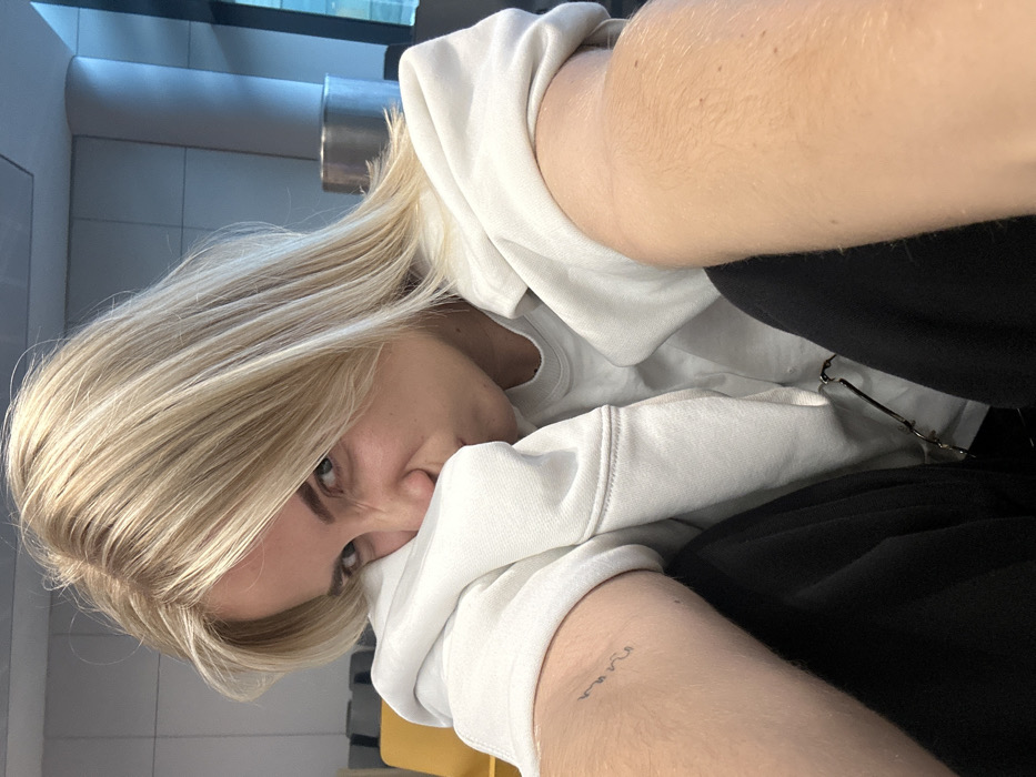 A fair-skinned female individual with blonde hair is depicted in a close-up, self-portrait style photograph taken indoors