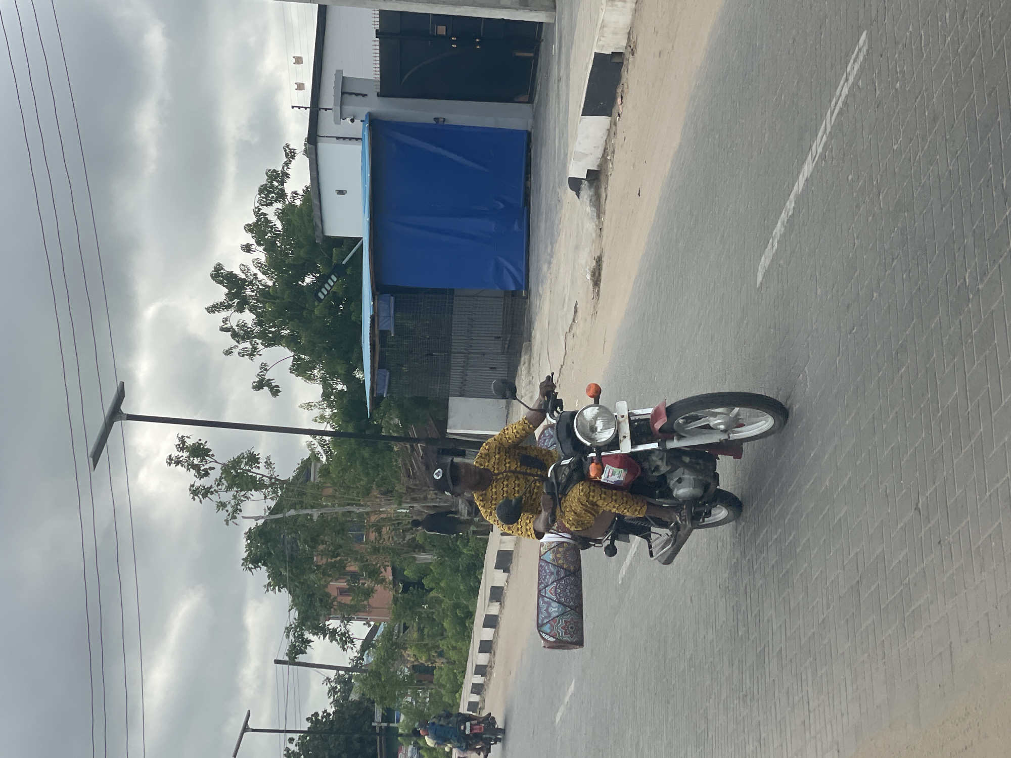 A man rides a red and silver motorcycle on a paved road in Badagry, Nigeria. The man is wearing a yellow patterned outfit and a black cap. He carries a cylindrical object with intricate patterns attached to the side of the motorcycle. The road is marked with a white line. A building with a blue tarp covering the entrance is in the background. Trees and power lines are also visible. Another motorcycle is behind him further down the road. The sky is overcast.